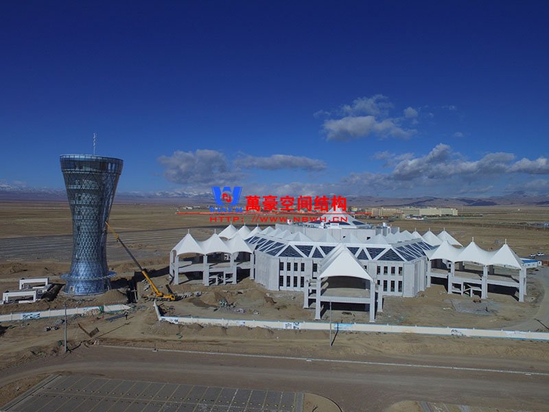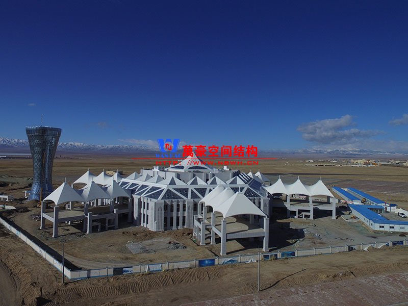 青海茶卡鹽湖天空之境集散中心鋼膜結(jié)構(gòu)項(xiàng)目位于擁有中國(guó)“天空之境”之稱的茶卡鹽湖。該項(xiàng)目分小蠻腰觀光塔和六角主樓兩部分,其中小蠻腰觀光塔由雙曲面空間鋼結(jié)構(gòu)相互交叉形成幾何形的外掛玻璃組成,主樓由雙曲面穹頂及6條連廊組成。鋼結(jié)構(gòu)跨度35米,鋼膜總面積28000平米,鋼結(jié)構(gòu)用鋼量1100噸。建筑內(nèi)部空間明亮通透,遠(yuǎn)觀猶如大漠孤煙中的鹽湖之晶,近觀仿佛置身于鹽湖中的浪漫滿屋。