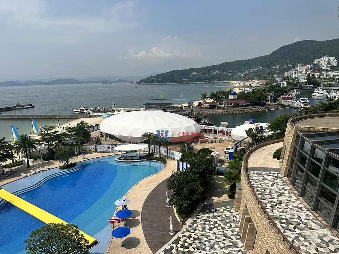 京基大梅沙酒店多功能活動(dòng)廳鋼膜結(jié)構(gòu)工程,該項(xiàng)目用鋼量約240噸,ETFE膜+PTFE膜展開(kāi)面積約2834平米。