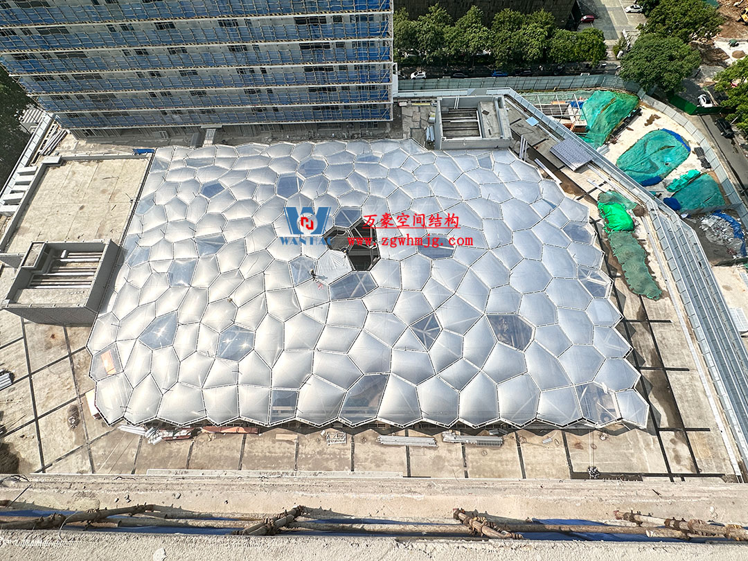 安吉縣昌碩小區(qū)地塊房產(chǎn)開發(fā)項(xiàng)目鋼結(jié)構(gòu)天幕項(xiàng)目,該項(xiàng)目用鋼量約260噸,ETFE膜展開面積約3182平米。