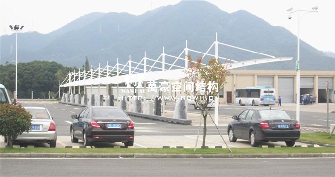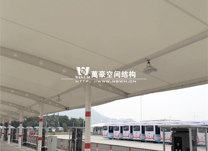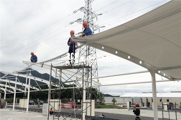 膜結(jié)構(gòu)雨棚施工面積約5138平方;用鋼量約80噸。施工難點在于工期緊。施工時天氣情況差,連續(xù)的陰雨天給鋼構(gòu)的油漆施工帶來了極大的麻煩并且延誤了工期。雨棚底下還要安裝充電樁,我們還要和充電樁施工班組進行技術(shù)對接,規(guī)劃充電樁的安裝位置。由于工期緊,天氣狀況差,我們動用了兩個施工班組加班加點,土建、鋼構(gòu)交叉施工,最后如期完工。由于每個雨棚長度比較長,施工班組在立好鋼構(gòu)件之后從中間開始往兩邊安裝膜布,使工作效率有了很大的提高。