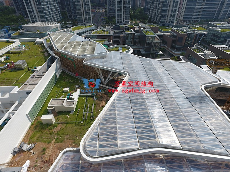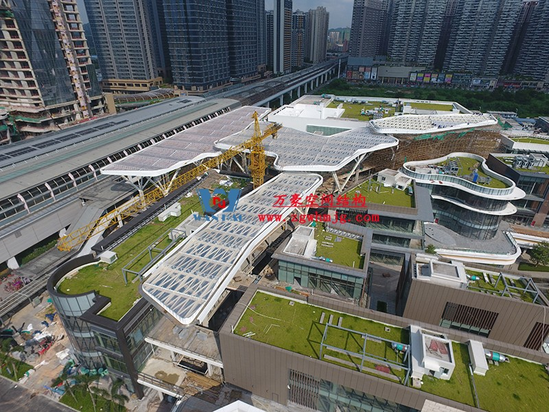 深圳龍華地鐵站ETFE天幕項目由我公司負(fù)責(zé)設(shè)計及承建,項目由4個出入口單體組成,ETFE展開面積9000平米,二次鋼結(jié)構(gòu)120噸,結(jié)構(gòu)落柱采用目前最流行的樹形節(jié)點支撐,在結(jié)構(gòu)安全的同時更具層次感。同時該項目也完美突出了ETFE膜材高透光、高自潔性及耐高溫的優(yōu)點。