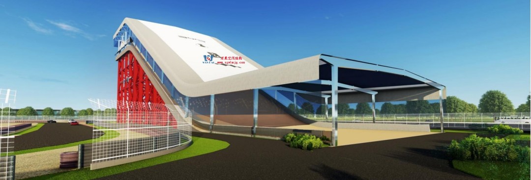 比亞迪紹興嵊州賽車場以極速競技與自然景觀的融合為設(shè)計(jì)核心,干拔沙坡觀景平臺(tái)作為賽道的標(biāo)志性節(jié)點(diǎn),同時(shí)滿足了功能性、標(biāo)志性與生態(tài)協(xié)調(diào)性。設(shè)計(jì)靈感來源于賽車疾馳時(shí)揚(yáng)起的沙浪與風(fēng)動(dòng)軌跡,通過鋼結(jié)構(gòu)的剛性骨架與膜材的柔性質(zhì)感,塑造出如沙丘起伏般的動(dòng)態(tài)形態(tài),既呼應(yīng)賽車場的速度美學(xué),又為觀眾提供遮陽避雨的舒適空間。該項(xiàng)目PTFE膜屋面展開超3萬平方米。