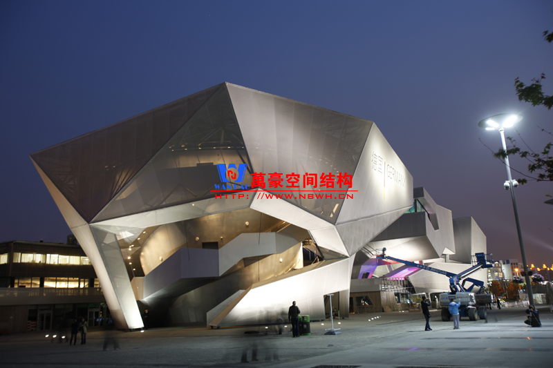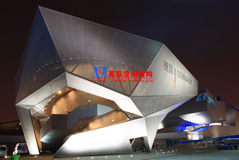 世博會德國館膜結(jié)構(gòu)建筑建成于2009年7月,于2010年在中國上海世博會上正式投入使用,是中國國內(nèi)經(jīng)典膜結(jié)構(gòu)建筑之一。德國館位于盧浦大橋附近的黃浦江南岸,與瑞士、法國和波蘭館相鄰,占地面積6000平方米。由于膜結(jié)構(gòu)材料的特殊屬性,可以讓德國館的形態(tài)呈不規(guī)則狀,十分的別致。展館四面呈開放狀,其建筑設(shè)計給人一種輕盈、飄逸的感覺,又像是在邀人同游。德國館的建筑體外部由一層透明的銀色發(fā)光建筑膜結(jié)構(gòu)包裝起來,展館的四大建筑主體懸架于和諧都市展廳入口所在的底層區(qū)域。