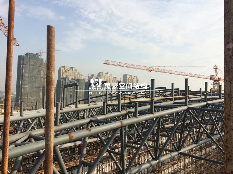 體育館項目鋼結(jié)構(gòu)現(xiàn)場施工中,本項目的主體結(jié)構(gòu)為三角管桁架結(jié)構(gòu),本公司設(shè)計部先進(jìn)行設(shè)計,然后在公司工廠的鋼結(jié)構(gòu)車間進(jìn)行加工,再運送到項目現(xiàn)場進(jìn)行吊裝。