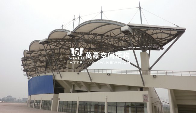 體育館膜結(jié)構(gòu)看臺工程總面積約7800平方米,地上一層,看臺主體高度為18.935米,挑棚最高處為23.2米,坐席數(shù)約5000個。