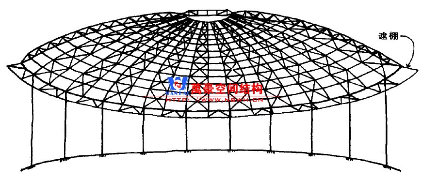 查爾斯.威廉郵政學(xué)院(CharlesWilliam Post College)于1970年建造了一個(gè)劇院。屋面采用鋼結(jié)構(gòu)穹頂,穹頂直徑約52米,由環(huán)繞于四周的鋼柱支承,鋼柱間沿經(jīng)線均勻布置四十榀鋼管桁架。穹頂頂部設(shè)鋼壓力環(huán),底部采用圓形的雨棚作為拉力環(huán)。緯向每隔一格布置連續(xù)十字交叉支撐。