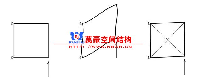 提高平面內(nèi)剛度的直接方式是采用三角形網(wǎng)格。富勒發(fā)明了短線呈穹頂,并應(yīng)用于1967年蒙特利爾國(guó)際博覽會(huì)上的美國(guó)館——一座直徑為76m的3/4球形建筑。