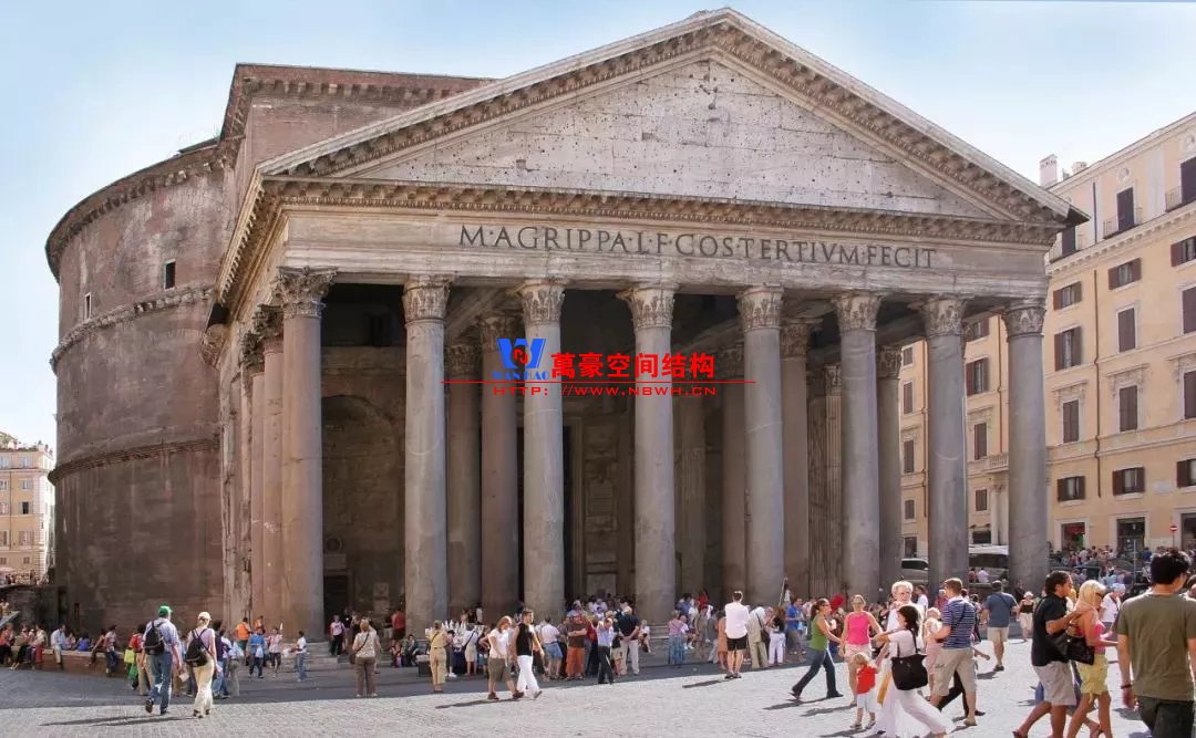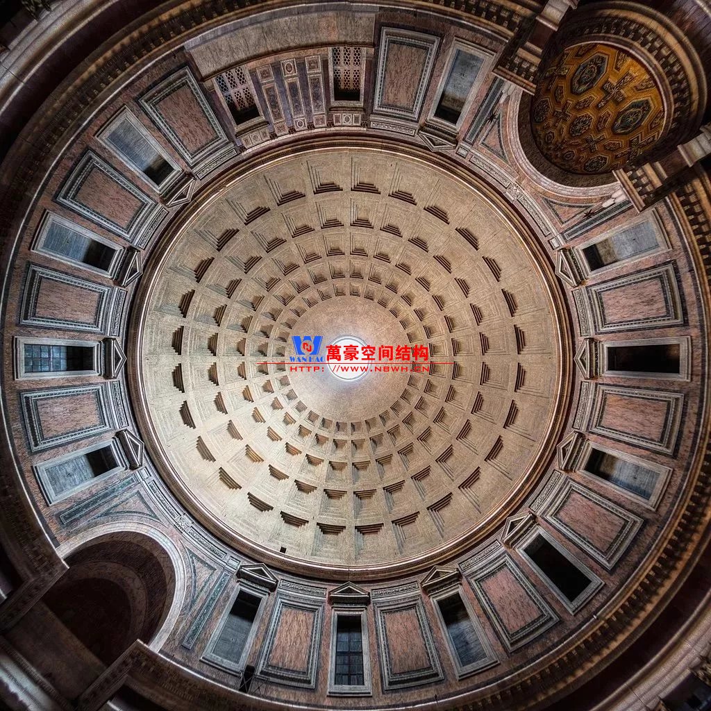 萬神殿穹頂直徑43.3米,最高點(diǎn)也是43.3米,中部采光洞口直徑8.9米。穹頂采用古老的混凝土,其材料特性與石塊類似,抗壓王者抗拉弱雞。而穹頂結(jié)構(gòu)以受壓為主,建筑材料與結(jié)構(gòu)體系可謂天作之合。