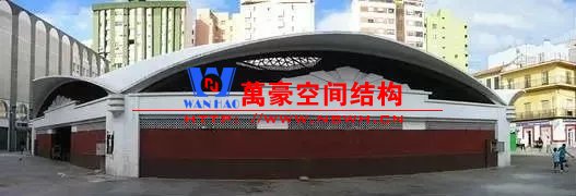 再比如托羅哈1933年在瑞士設(shè)計(jì)的阿赫西拉斯鎮(zhèn)集市屋面。正八角形穹頂直徑達(dá)47.6m,曲率半徑為44.2m。作為單一的球殼,它的跨度第一次超越了萬神廟穹頂。殼體厚度最小為8.9cm,厚跨比是1/535;支承點(diǎn)附近加厚至45.7cm。