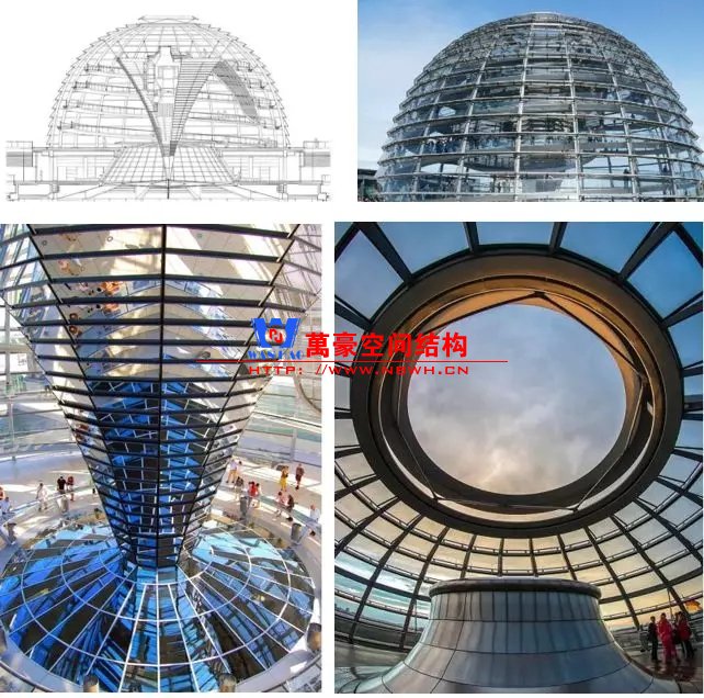 德國國會(huì)大廈改造中的穹頂即采用了肋環(huán)式網(wǎng)殼,中庭中部還有一螺旋式通道一直引領(lǐng)人們到達(dá)圓頂和瞭望平臺(tái)。相對(duì)于混凝土網(wǎng)殼,鋼與玻璃的組合通透性更好,同時(shí)也更符合密斯對(duì)于現(xiàn)代建筑的定義和現(xiàn)代人的審美標(biāo)準(zhǔn)。
