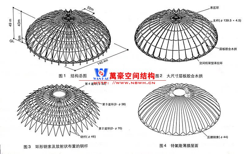 出云穹頂,球形穹頂直徑143.8米,拱頂部高度48.9m米。它最大的結(jié)構(gòu)特點(diǎn)是綜合性。材料上有鋼、木、薄膜;結(jié)構(gòu)形式上有拱、桁架、索膜結(jié)構(gòu),并充分發(fā)揮了每個(gè)部份的優(yōu)勢(shì)。