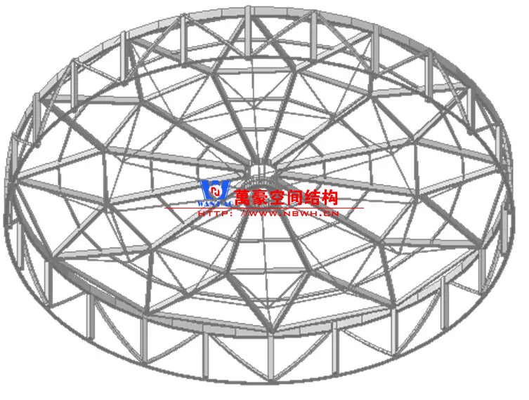 最終選擇弦支穹頂,上弦鋼梁呈肋環(huán)型布置,增加方向性;下弦遮陽帷幕布置于拉索空擋,在減少構(gòu)造層次的同時(shí),結(jié)構(gòu)構(gòu)件與遮陽帷幕虛實(shí)結(jié)合,既表現(xiàn)結(jié)構(gòu)又不刻意表現(xiàn)結(jié)構(gòu)。