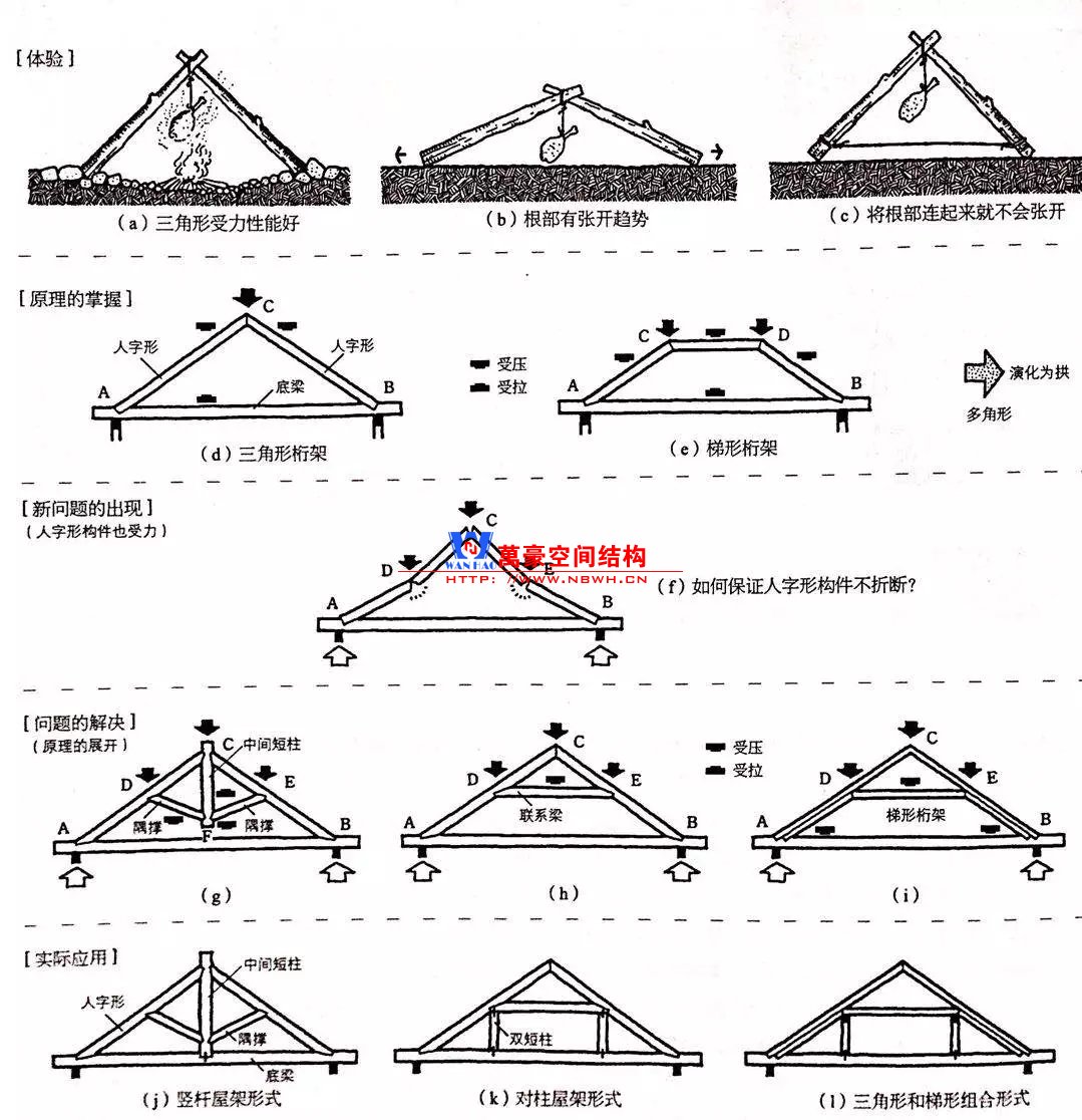 早在兩千年前,人類的祖先就發(fā)現(xiàn)了三角形的穩(wěn)定性原理,并發(fā)明了三角桁架,廣泛應(yīng)用在古代住房的木制屋蓋中。三角桁架與梁、拱一樣,是古代建筑實(shí)現(xiàn)跨越的最主要方法。