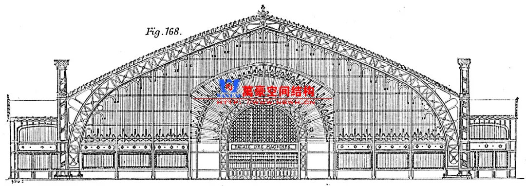 巴黎世博會(huì)機(jī)械館由工程師J·B.Krantz和埃菲爾Eifel設(shè)計(jì),于1867年建成。它采用鋼制三鉸拱,拱截面為桁架格構(gòu)形式。共有20榀這樣的鋼拱,形成寬115米、長(zhǎng)420米,內(nèi)部毫無(wú)阻擋的龐大室內(nèi)空間。