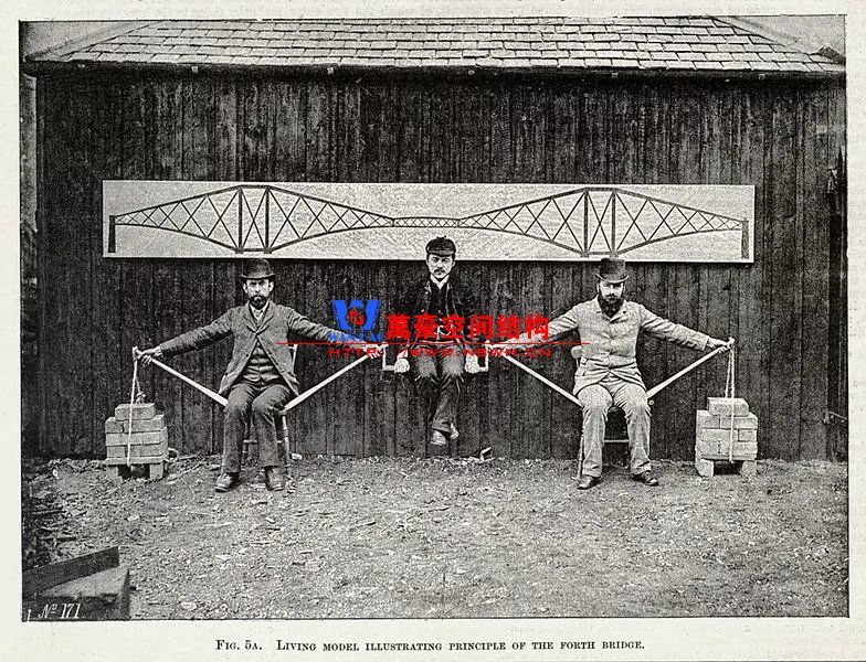 為了市民解釋?xiě)冶坭旒軜蛄旱脑?,工程師做了一個(gè)簡(jiǎn)易的示范試驗(yàn),以手臂作桁架拉桿、鋼棒作壓桿,兩人坐在椅子上很輕松地托起中間跨的重荷載(簡(jiǎn)支桁架段)。圖中的三人分別是大橋的設(shè)計(jì)師JohnFowler、BenjaminBaker和工程指揮渡邊嘉一。