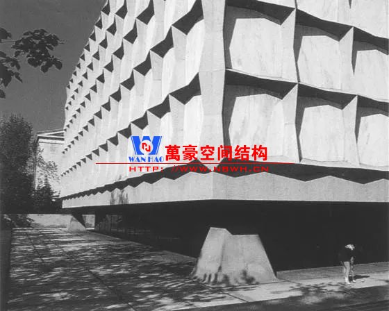 耶魯大學(xué)善本圖書(shū)館采用了多層空腹桁架。建筑上部五層整體構(gòu)成空腹桁架由四角的柱墩支承,建筑首層全部架空。