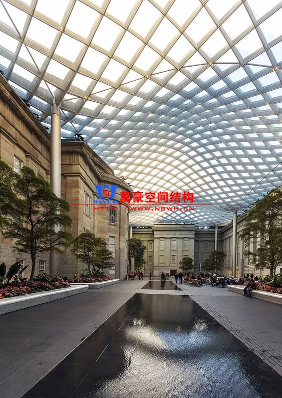 這個經(jīng)典的改造項(xiàng)目把輕與重巧妙組合。鋼結(jié)構(gòu)網(wǎng)殼內(nèi)側(cè)支承于圓形閱覽室,外側(cè)支承于方形博物館建筑的內(nèi)墻,通過找形分析得到一個拱起的規(guī)則形態(tài)。