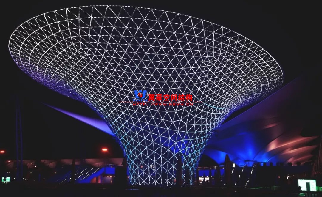 有的天幕雖然設(shè)計為曲面,但其曲面形狀的力學(xué)性能差,結(jié)構(gòu)受力仍然以抗彎為主。這類曲面天幕結(jié)構(gòu)與樹形柱相結(jié)合,才能以較細(xì)小的結(jié)構(gòu)構(gòu)件完成。