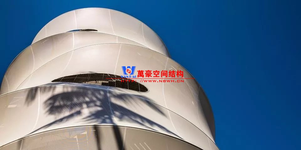 與島上其他傳統(tǒng)的“塔瓦魯”風(fēng)格建筑不同,由于其高度為23米,并且采用特殊結(jié)構(gòu),目前的結(jié)構(gòu)在島上占主導(dǎo)地位。建筑物的正面使用了鋼筋混凝土整體結(jié)構(gòu),而不是傳統(tǒng)的天然材料。它用作支撐管,由各個(gè)預(yù)制臺(tái)階制成的控制臺(tái)樓梯圍繞該支撐管旋轉(zhuǎn)。外圍的所有元素都被遮蓋在淺灰色半透明的法拉利381網(wǎng)孔膜中,遮陽(yáng)隔熱,又不影響視覺(jué)通透性。