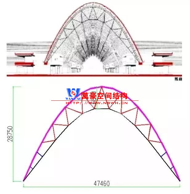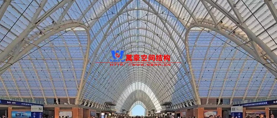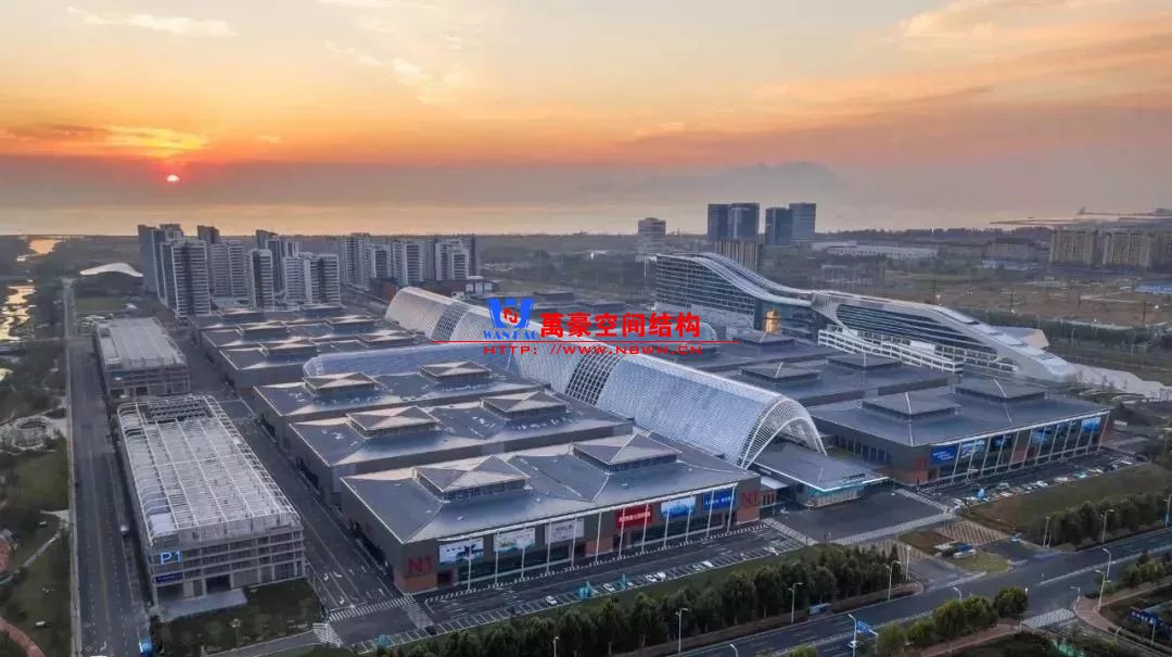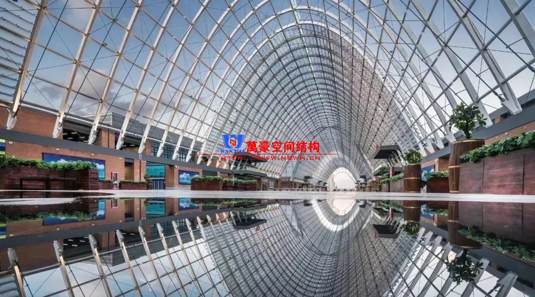 建筑內(nèi)在的空間結(jié)構(gòu)形成了外部形態(tài)的美學(xué)韻律和視覺(jué)沖擊力,使建筑形象真實(shí)而動(dòng)人。包括展廊與展廳兩部分,以中央十字展廊為功能組織核心,南北各布置6個(gè)、共12個(gè)獨(dú)立展廳單元(尺寸74.4m×136.4m,采用變標(biāo)高的空間桁架鋼結(jié)構(gòu))。展廊平面呈十字型布置,東西向長(zhǎng)507m,南北向長(zhǎng)287m,主拱和次拱方向分別設(shè)置兩道溫度縫,最高點(diǎn)標(biāo)高為35.0m。