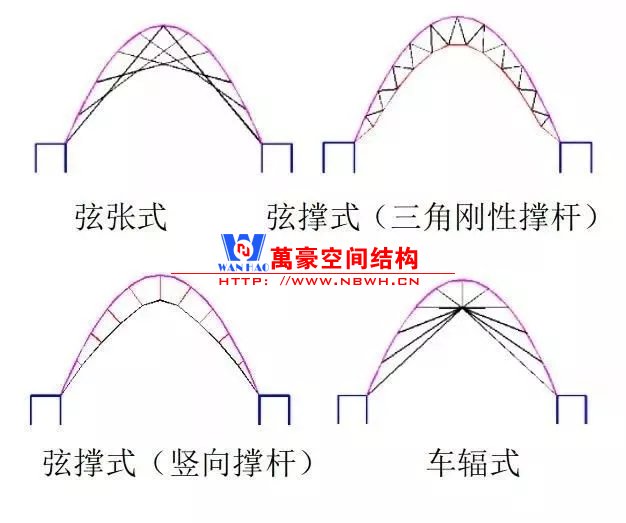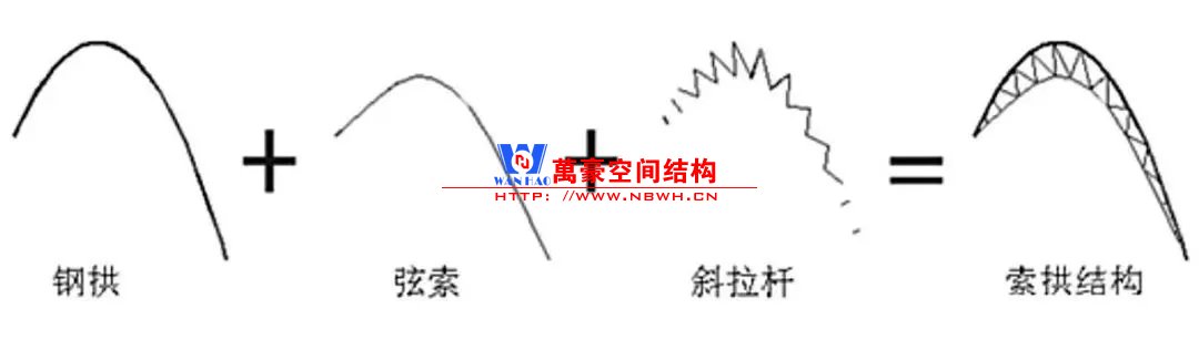 下部主體結(jié)構(gòu)為混凝土框架體系,地上一層,局部設(shè)置一層地下室。十字展廊屋蓋結(jié)構(gòu)為預(yù)應(yīng)力索拱結(jié)構(gòu),索拱平面外順柱面網(wǎng)殼沿縱向利用高強(qiáng)鋼拉桿通長(zhǎng)設(shè)置交叉支撐,以保障索拱面外的穩(wěn)定。