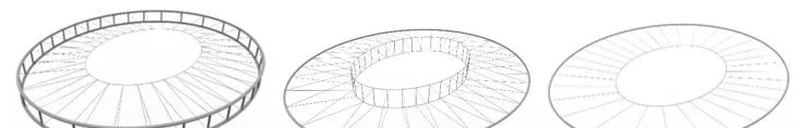 新建的屋蓋結(jié)構(gòu),徑向距內(nèi)環(huán)1/3跨度的位置設(shè)置飛柱,來加強(qiáng)整個(gè)屋蓋結(jié)構(gòu)的穩(wěn)定性和剛度。結(jié)構(gòu)中引入飛柱后得到了類似非常形狀的索桁架結(jié)構(gòu),在索桁架的最外側(cè)為壓環(huán),而在剩余的三個(gè)內(nèi)部的角點(diǎn)上則均為環(huán)形索構(gòu)成的拉環(huán)。