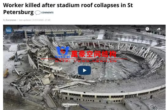 據(jù)外媒報道,俄羅斯圣彼得堡一個大型體育館的屋頂在重建過程中倒塌。正在施工的兩名工人,一名設法逃入升降機,而另一名工作人員墜落遇難。