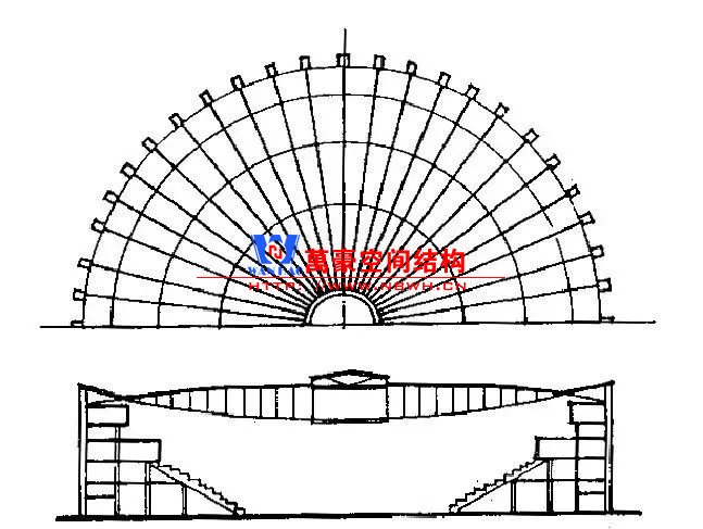 結構體系為輪輻式雙層懸索體系。外環(huán)直徑93m,內環(huán)直徑12m。輻射狀布置48組索桁架,索桁架高跨比1/17,承重索直徑63mm,穩(wěn)定索直徑42.5mm。鋼筋混凝土外環(huán)截面2.8m*0.62m,屋面為4mm厚有肋薄鋼板。沿環(huán)向與豎向腹桿對應處,布置了兩圈豎向鋼板支撐體系,提高了結構整體性能,減低了自身高度。屋蓋用鋼量99.3kg/m2。