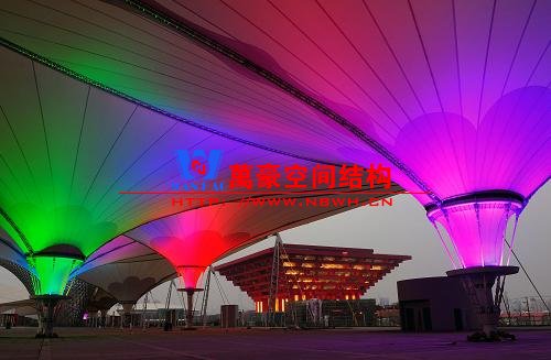 世博軸ptfe索膜結(jié)構(gòu)是迄今為止世界規(guī)模最大的連續(xù)張拉索膜結(jié)構(gòu),膜材選用了一種名為PTFE(聚四氟乙烯)的涂層玻璃纖維,具有不易燃性、防紫外線、抗風化、自潔性、高反射性等特點,完全可以適應上海地區(qū)的臺風氣候。陽光谷ptfe索膜結(jié)構(gòu)只有在十級以上的風力,才會出現(xiàn)明顯的位移,這個位移也在可以控制的范圍之內(nèi)。陽光谷建筑負責人驕傲的告訴記者。上海世博會工程建設指揮部辦公室的市政項目部總經(jīng)理趙克平透露,張拉膜總面積約77224m2,最大跨度約97米,由31個外側(cè)桅桿,19個下拉點以及18個與陽光谷的拉接點通過13種不同功能索張拉而成,膜片數(shù)量69片,其中最大的膜單片面積達1780m2。