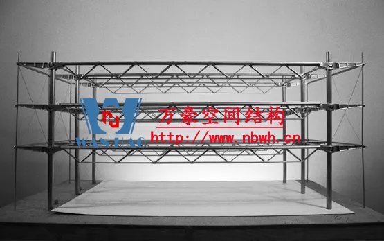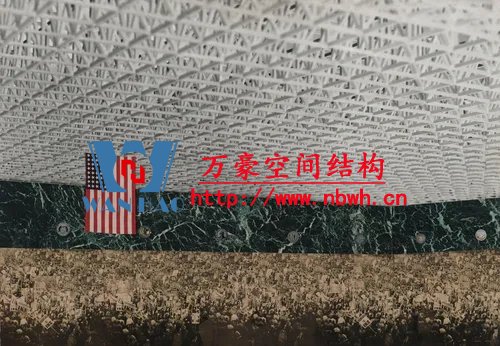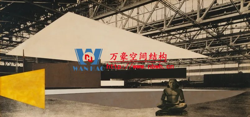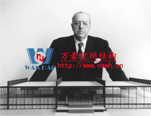 1942年,密斯制作了一個音樂廳的照片拼貼畫,采用阿爾伯特·康于1937年設(shè)計的格倫·馬丁飛機(jī)組裝大樓的室內(nèi)做為背景,在其中設(shè)置了木材和鋼板制成的靈活的墻和頂棚,疊加上他的基本空間概念。阿爾伯特·康是為亨利·福特和其他底特律汽車工業(yè)家服務(wù)的建筑師,設(shè)計了適應(yīng)于汽車生產(chǎn)線的大空間廠房。30年代末,美國的鋼鐵技術(shù)已經(jīng)能夠生產(chǎn)更大的斷面,焊接方法開始在建筑中替代鉚接,使節(jié)點更為簡潔。這些新技術(shù)促成了更大跨度的屋蓋,增加了建筑空間的可能性。1952-1953年,密斯又發(fā)展了康拉德·瓦克斯曼為美國空軍機(jī)庫所設(shè)計的結(jié)構(gòu),為芝加哥會議中心設(shè)計了一個會議大廳,約720英尺見方,屋面采用網(wǎng)架結(jié)構(gòu),結(jié)構(gòu)高度約30英尺,側(cè)面端頭懸挑達(dá)60英尺。拼貼畫的室內(nèi)使用大理石紋理代表大空間內(nèi)的墻體飾面。密斯引用康和瓦克斯曼的結(jié)構(gòu)做為自己作品的支撐,啟示了一個鋼結(jié)構(gòu)通用大空間的新時代。