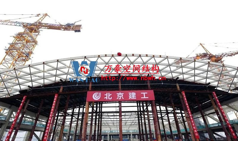 正在滑移施工的鋼屋面網(wǎng)殼用鋼量約2800噸,南北長168米,東西跨度72米,鋼屋蓋網(wǎng)殼面積大,距離地面高度為44米-52米,高空作業(yè)量大,構(gòu)件吊次多達(dá)3000次,吊裝時間約2個月,工期緊,鋼結(jié)構(gòu)焊接精度和質(zhì)量要求極高,屋蓋網(wǎng)殼為索承結(jié)構(gòu),控制變形難度大。