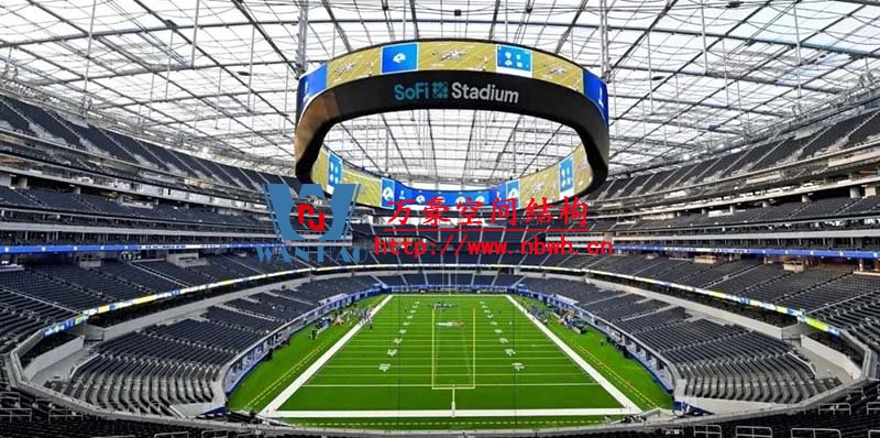 新球場名叫SoFi體育場,是Social和Finance頭兩個字母的組合。球場和周邊設(shè)施總占地120萬平米,總耗資超過350億元。設(shè)有70240個座位, 總共能容納超過10萬人。建成后將成為NFL最大的體育場。