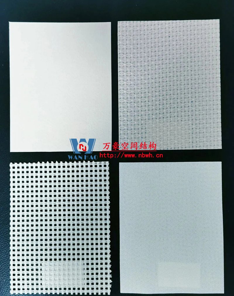 是最常用的膜材,由高強(qiáng)度纖維織物涂覆耐久性保護(hù)涂層構(gòu)成。特點(diǎn)是強(qiáng)度高、自潔性好、擋風(fēng)遮雨(不透氣、不透水);有一定透光率(8~15%,透光不透景),不吸音。