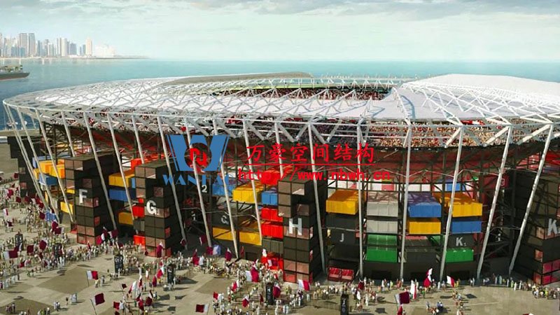 容量40000人。拉斯阿布阿布德體育場將成為有史以來第一個可移動和可重復(fù)使用的世界杯體育場。體育場位于45萬平方米的海濱,由從附近港口回收的集裝箱建造而成。在建筑材料方面的這一決定將有助于快速施工,并允許結(jié)構(gòu)在比賽后很容易拆除和運輸。每個集裝箱模塊將運到一個巨型油輪的背面,然后可以插入體育場的外殼。這些集裝箱將會安置座位、廁所、食物攤位和商店,從地面看像樂高組合一樣放在一起。