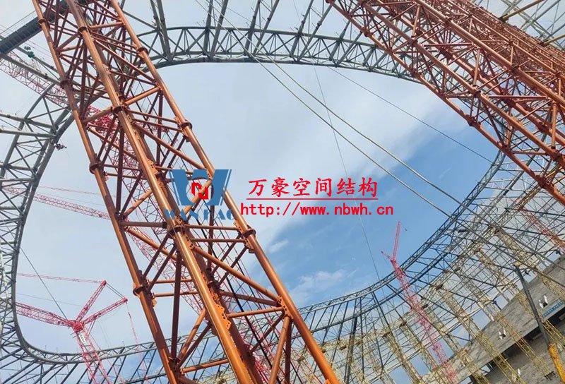 鋼罩棚平衡區(qū)長度27m,內(nèi)部主桁架懸挑長度最大達58m。懸挑部分位于看臺上方,安裝高度高達59.5m。單榀桁架最大單重55t,單根鋼柱重量達60t。