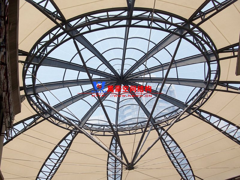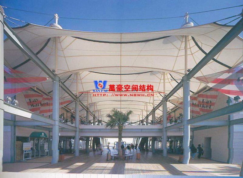 商業(yè)街膜結(jié)構(gòu)的獨特外形體現(xiàn)了建筑自身的自然美感。商業(yè)街膜結(jié)構(gòu)本身和與其相協(xié)調(diào)的傳統(tǒng)建筑一起構(gòu)成了令人興致盎然的地面標(biāo)志性建筑。優(yōu)秀的商業(yè)街膜結(jié)構(gòu)設(shè)計是結(jié)構(gòu)與外形的有機融合,使其顯得出類拔萃,可為其周邊空間增添活力,成為周圍環(huán)境的補充和焦點。