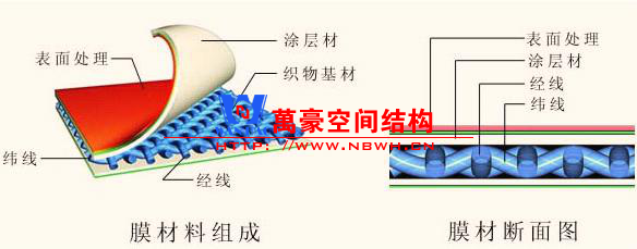 用于膜結(jié)構(gòu)建筑中的膜材是一種具有強(qiáng)度,柔韌性好的薄膜材料,是由纖維編織成織物基材,在其基材兩面以樹脂為涂層材所加工固定而成的材料,中心的織物基材分為聚酯纖維及玻璃纖維,而作為涂層材使用的樹脂有聚氯乙烯樹脂(PVC)及聚四氟乙烯樹脂(PTFE),在力學(xué)上織物基材及涂層材分別具有以下功能性質(zhì)。