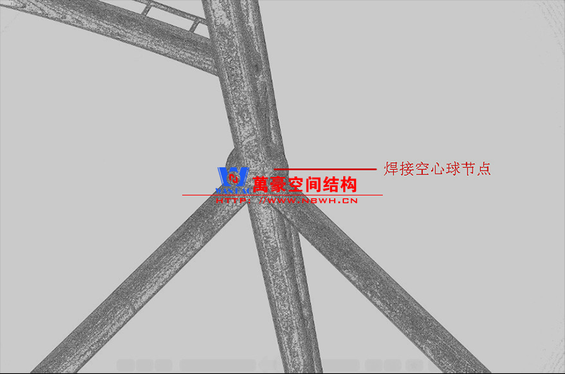 次梁延長桁架與“V”型支架的節(jié)點形式為管球節(jié)點,整個管球節(jié)點是鋼屋蓋結構中最關鍵的構件之一,與“V”型支架呈單幅式三角形。其下部“V”型支架與預埋牛腿連接,徑向次梁桁架與主立柱連接。其中,焊接空心球與“V”型支架節(jié)點先作為臨時固定焊縫使用。