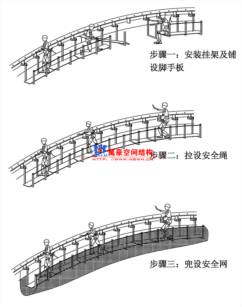 針對現(xiàn)場作業(yè)條件考慮使用懸掛腳手架的方案。焊接式掛架利用端部的掛鉤直接懸掛在鋼結構連接板的位置。焊接式掛架現(xiàn)場安裝時必須保證掛架與地面垂直,掛架內(nèi)、外兩側各設安全防護繩, 每隔五個掛架拉一對防晃纖繩與二次部材筋板拉結,防止擺動。