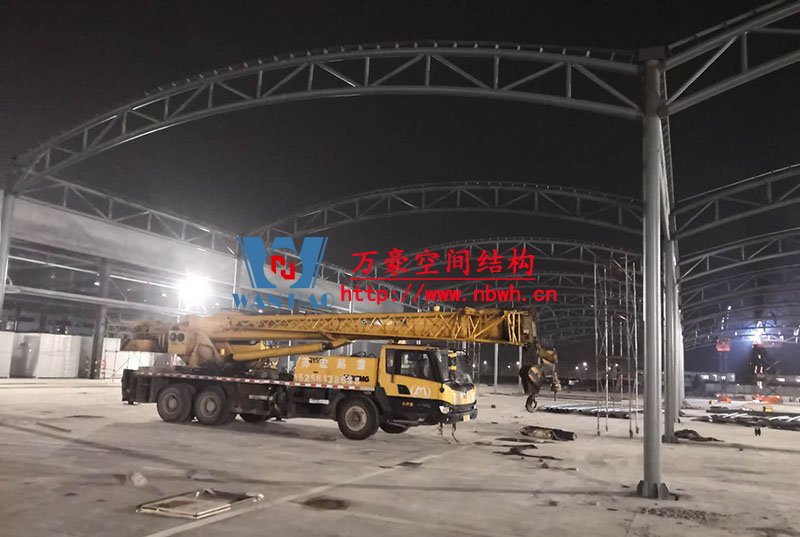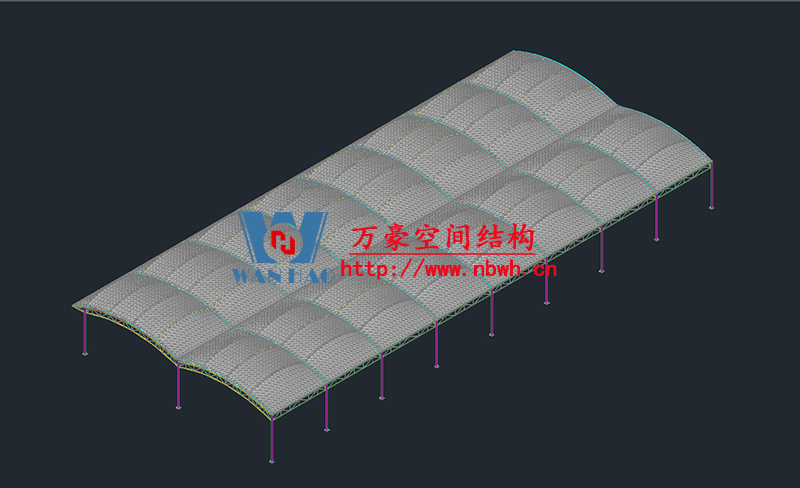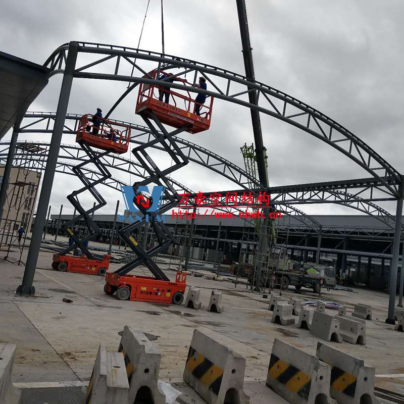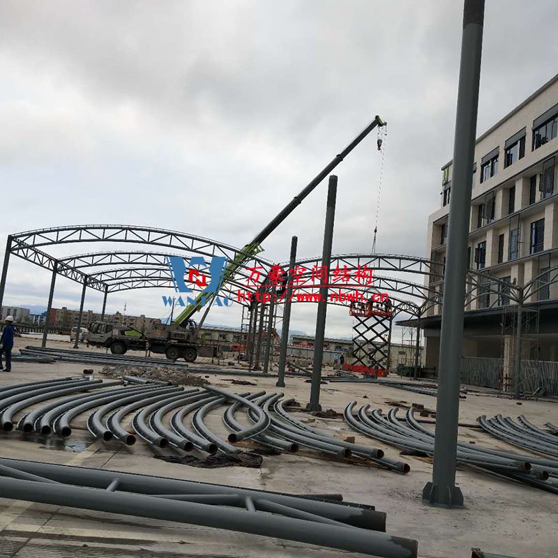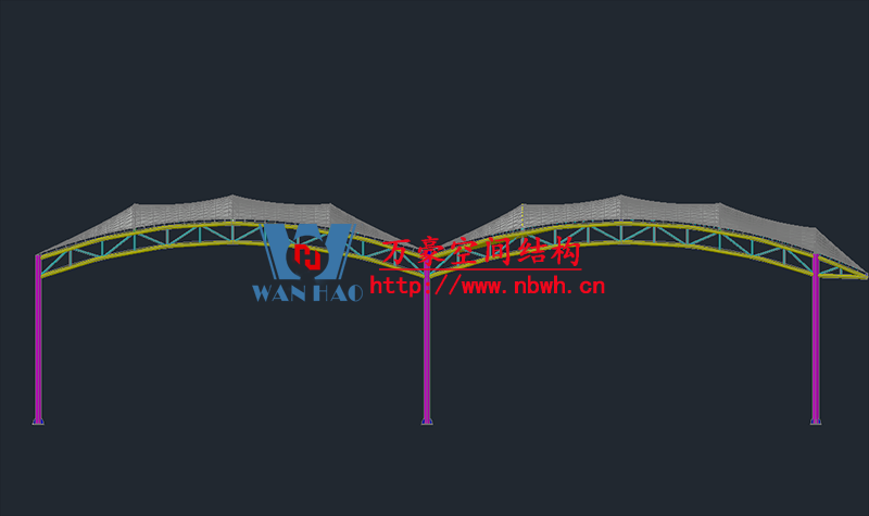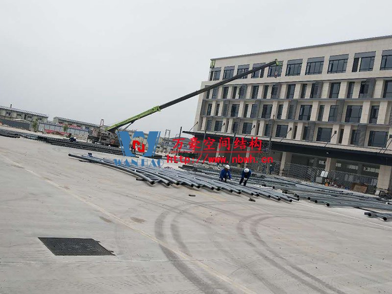 奉化方橋農(nóng)副鋼結(jié)構(gòu)雨棚工程位于浙江省寧波市奉化市內(nèi),此工程用鋼量100噸,膜結(jié)構(gòu)展開(kāi)面積3500平米,由寧波萬(wàn)豪空間結(jié)構(gòu)工程有限公司承建。