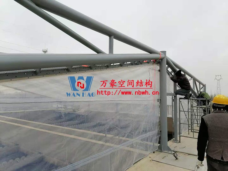 該工程主要建設(shè)格爾木工業(yè)園昆侖工業(yè)區(qū)工業(yè)污水處理廠首期2.5萬(wàn)立方米/天工程二沉池、水解酸化池和預(yù)沉池池體保溫膜結(jié)構(gòu)安裝。項(xiàng)目用鋼量230噸,膜結(jié)構(gòu)展開面積5000平米。
