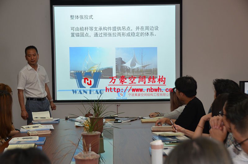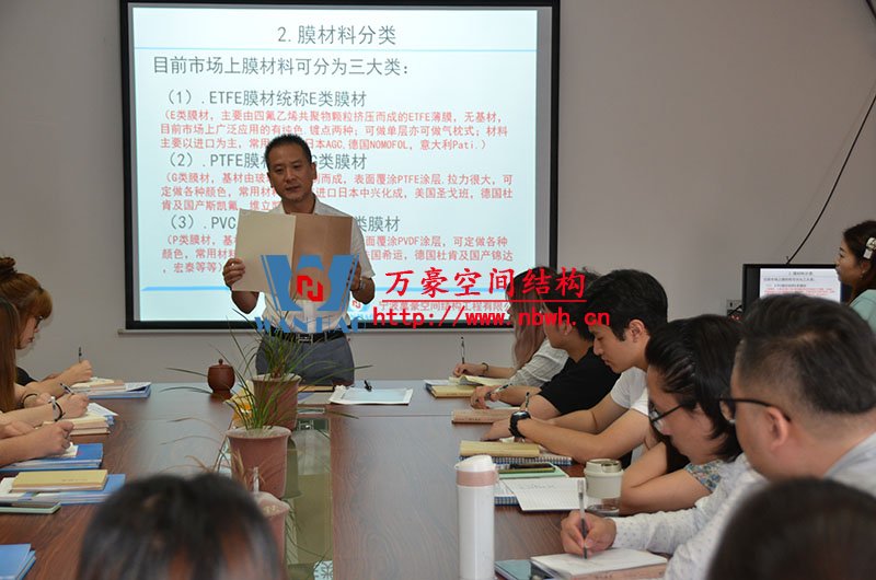 最后,由萬豪總經(jīng)理張總給大家分享萬豪空間結構企業(yè)文化及全面的膜結構工程技術知識。內(nèi)容包括膜結構行業(yè)發(fā)展現(xiàn)狀、膜材料分類、膜結構優(yōu)勢及應用領域、膜結構產(chǎn)品結構形式等。