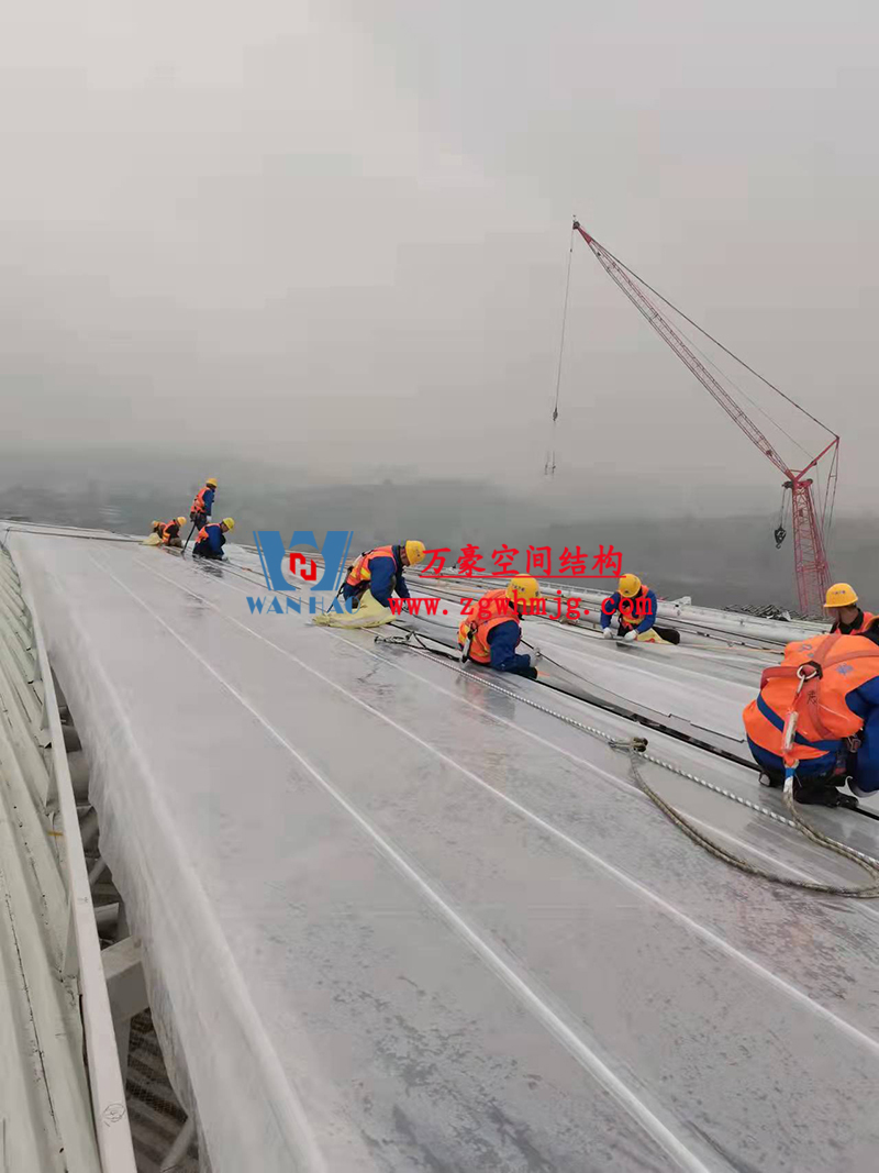 重慶龍興足球場(chǎng)ETFE屋面膜結(jié)構(gòu)工程屋面鋼結(jié)構(gòu)完成,膜結(jié)構(gòu)安裝中