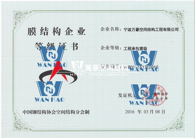 憑借著公司的硬實力,寧波萬豪空間結(jié)構(gòu)工程有限公司在膜結(jié)構(gòu)企業(yè)等級會員第十六次評審中榮獲工程承包、專項設(shè)計雙一級資質(zhì)。標志著公司向前更進一步,也是協(xié)會對公司實力的認可,公司將不斷努力,為膜結(jié)構(gòu)行業(yè)的發(fā)展貢獻自己的力量。