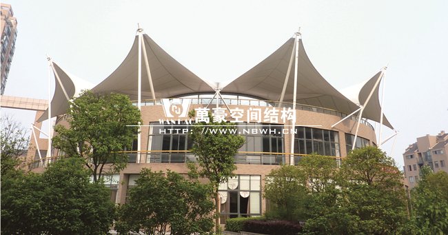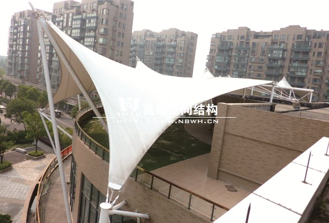 工程屹立在寧波鄞州區(qū)紫郡小區(qū),作為小區(qū)售樓處屋頂景觀,整體工程有8片單體膜組成,每片單體膜展開(kāi)面積約50平方米,結(jié)構(gòu)造型飄逸輕盈,結(jié)構(gòu)受力有墻體承載,為張拉式膜建筑的典型代表,膜材高低起伏,形如波濤拍岸。極具現(xiàn)代化氣息,和諧的融與環(huán)境,成為商業(yè)小區(qū)的一道亮麗風(fēng)景線。